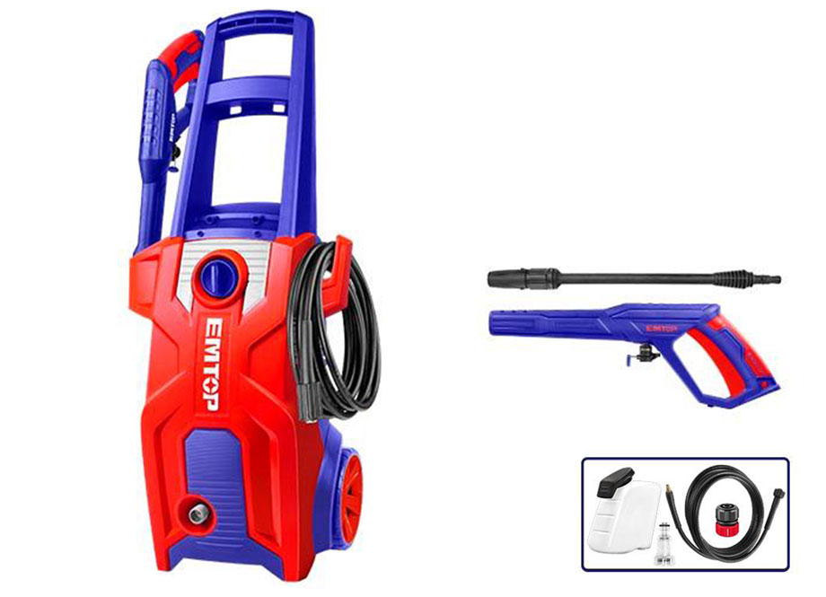 La hidrolimpiadora Emtop EHPW1801 es un equipo que presuriza el agua y permite que la misma salga a través de una pistola a presión de hasta de 150 bar, esto reduce los tiempos de trabajo y ahorro en el consumo de agua aligerando la labor de limpiar en cualquier superficie.