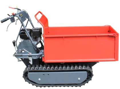 Mini transporter 500kg Roteco, motor Loncin 6.5HP, direccion mecanica accionada por levas de bloqueo, traccion con orugas de caucho, cambio de 4 velocidades (3A + 1RM) 6km/h, plataforma de carga extensible de 1000x750x850, basculante manual, carga maxima 500kg.